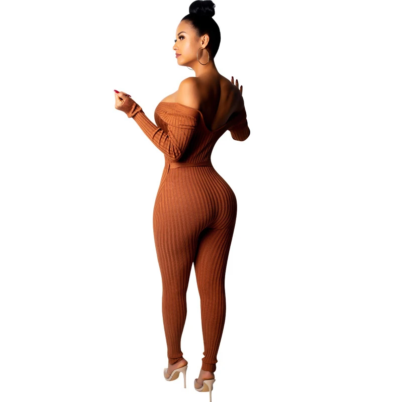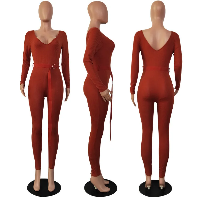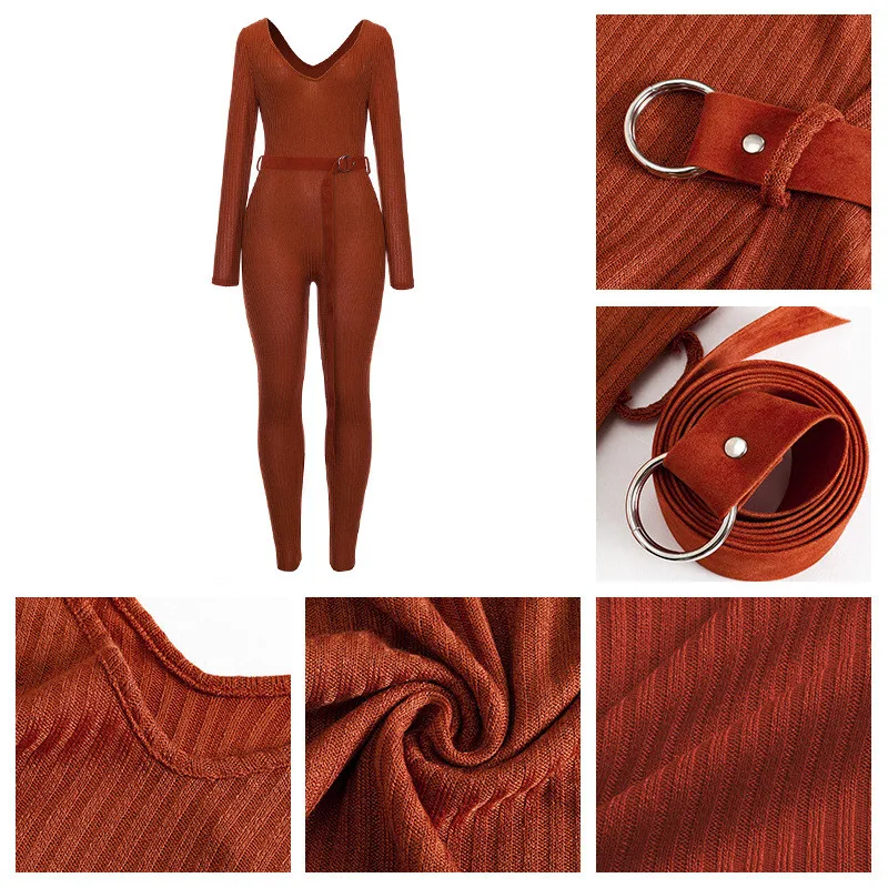Product Name: Женский трикотажный комбинезон Adogirl, однотонный комбинезон в рубчик с открытыми плечами и поясом, с v образным вырезом и длинными рукавами