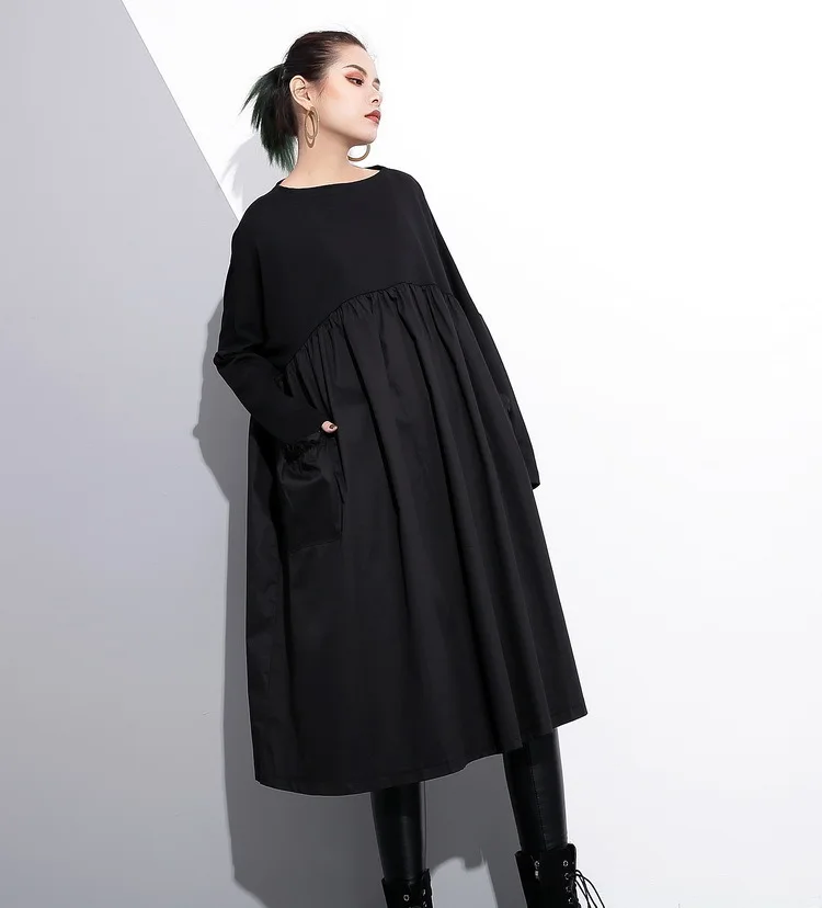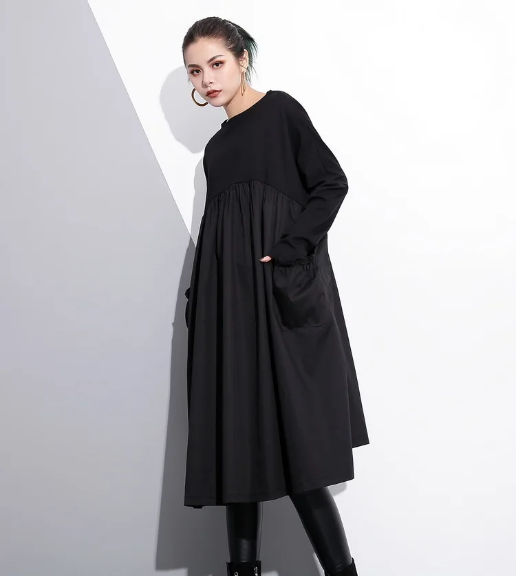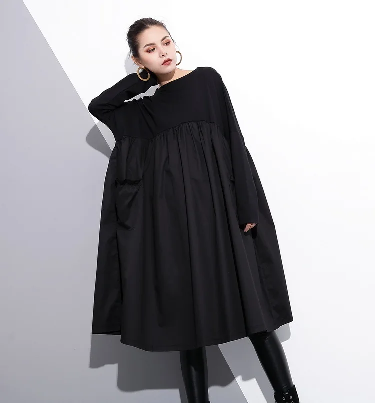Product Name: [EAM] 2020 Новое весеннее черное платье с круглым вырезом и длинным рукавом большого размера, с карманами, с разрезом, большой размер, женское мо...