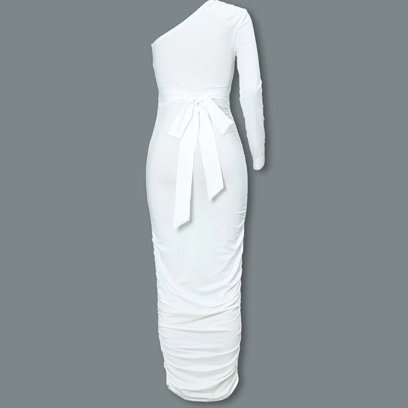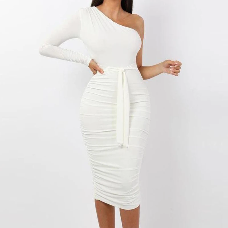 Product Name: Женское элегантное модное сексуальное белое коктейльное облегающее платье на одно плечо с поясом и рюшами, облегающее платье миди