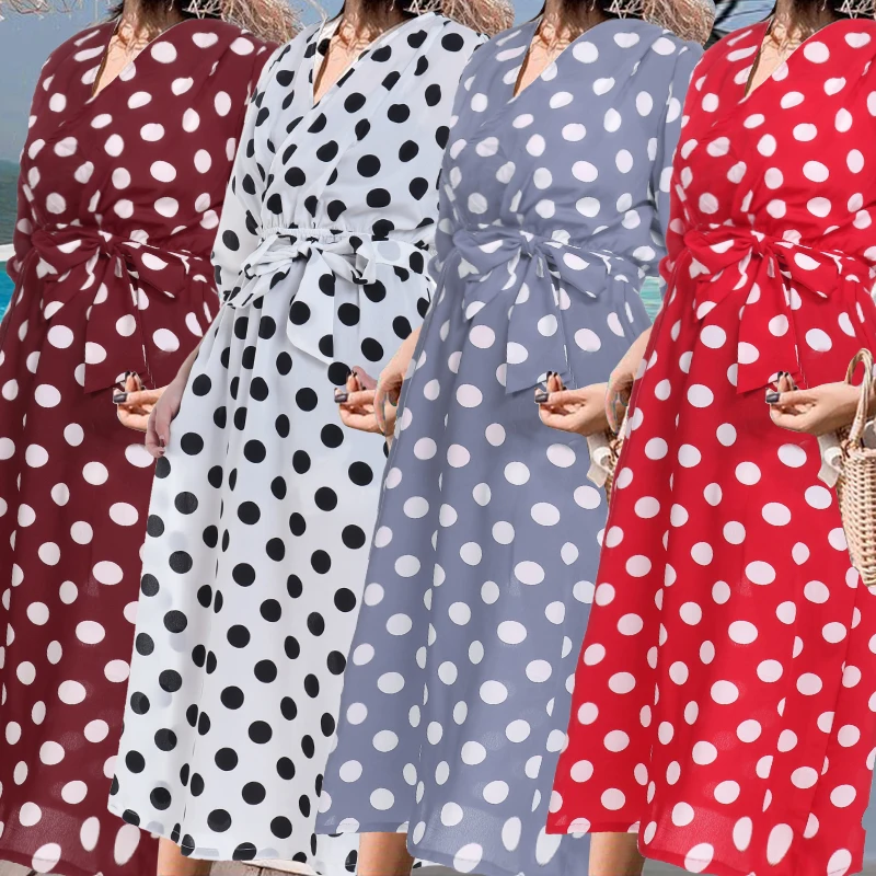 Product Name: Женское длинное платье макси в Корейском стиле, летнее богемное платье с v образным вырезом, повседневное Свободное платье в горошек с поясо...