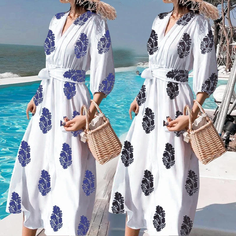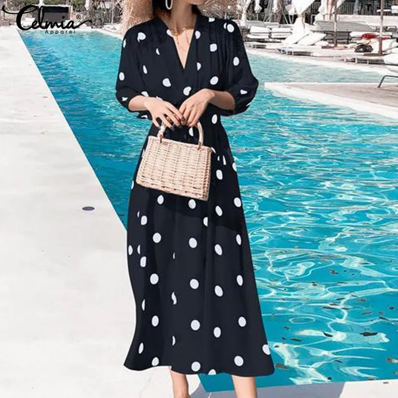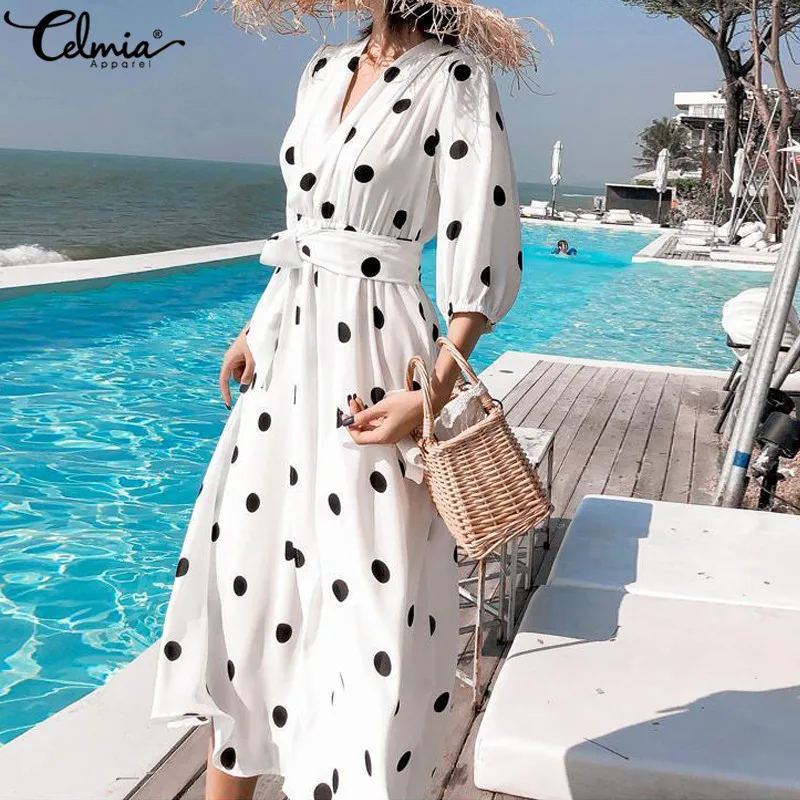 Special Offer Женское длинное платье макси в Корейском стиле, летнее богемное платье с v образным вырезом, повседневное Свободное платье в горошек с поясо... Discount 42% Today!