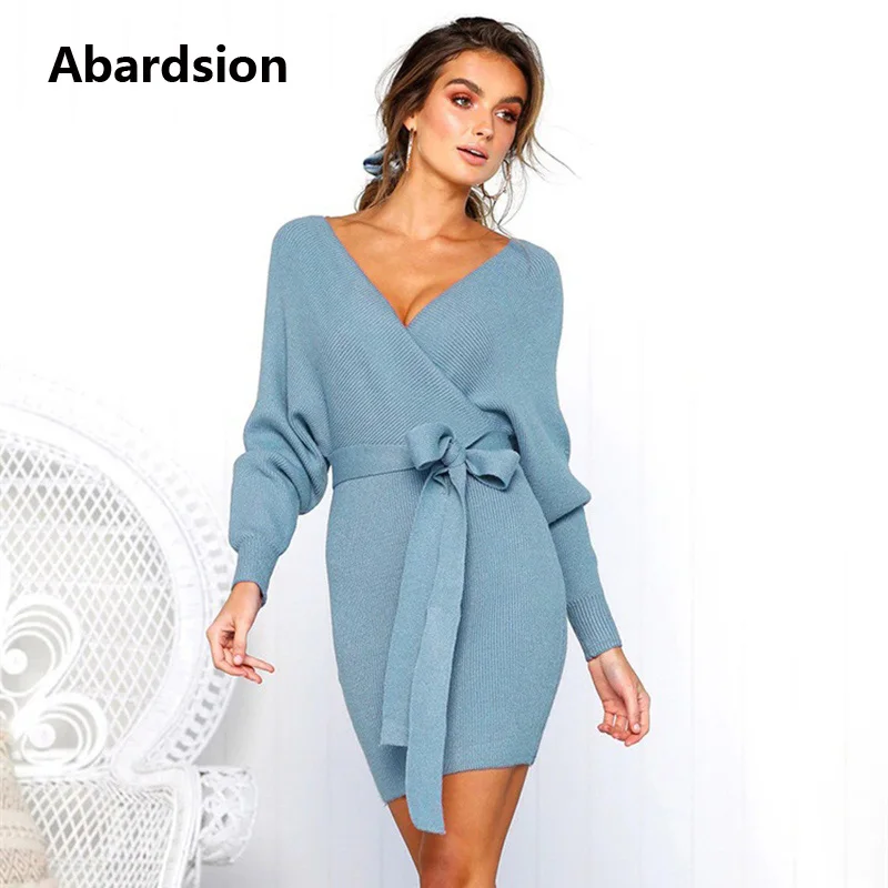 Special Offer Abardsion женское платье свитер, осеннее платье, Vestidos 2019, женские платья с длинным рукавом, v образным вырезом, поясом, открытой спиной, облегающи... Discount 45% Today!