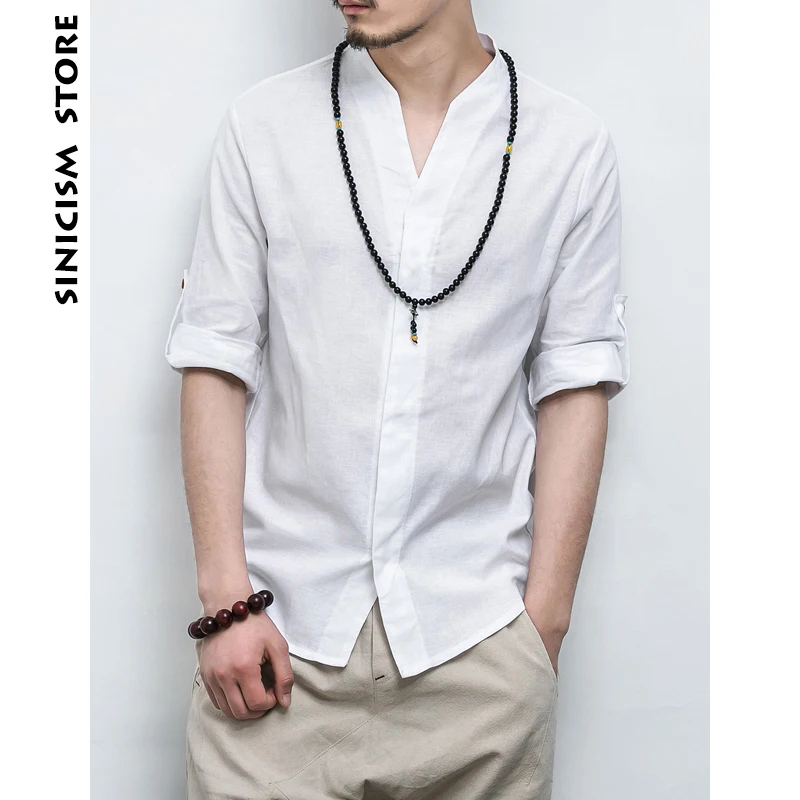 (45% Off) Купить Мужская хлопковая льняная рубашка Sinicism Store, Однотонная с рукавом три четверти в китайском стиле, V образным вырезом, большо... Продажа Дешево