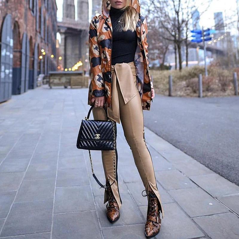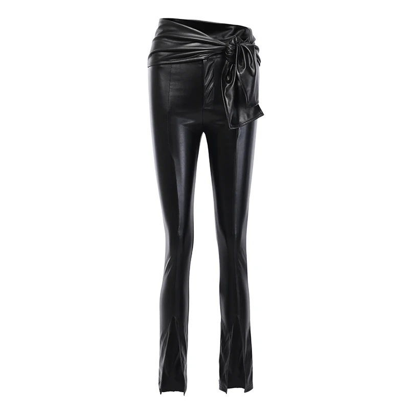(51% Off) Купить InstaHot Highstreet черные брюки карандаш из искусственной кожи с оборкой и поясом, вырез снизу спереди на штанинах, женские осенние узкие брюки Продажа Дешево