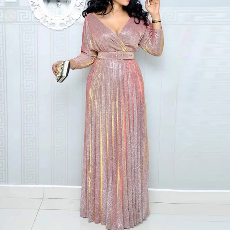Product Name: Женское длинное плиссированное платье с высокой талией, розовое платье макси с глубоким v образным вырезом и поясом на осень, 2019