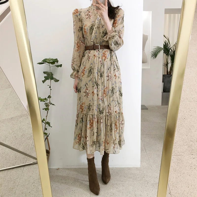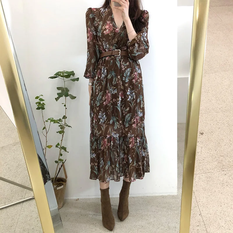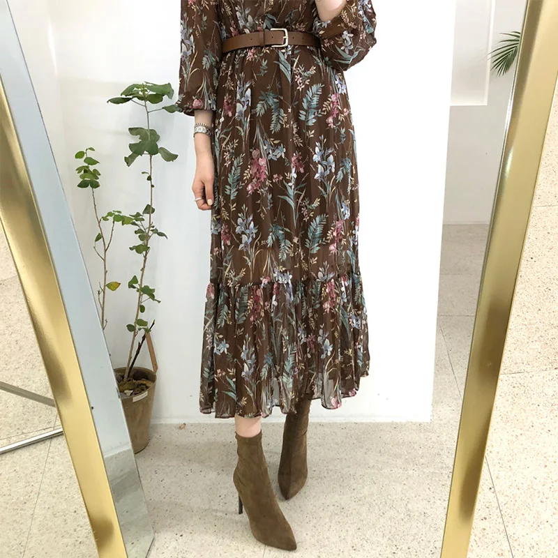 Product Name: Женское шифоновое платье средней длины с цветочным принтом в Корейском стиле, элегантное платье с поясом, весна лето 2019