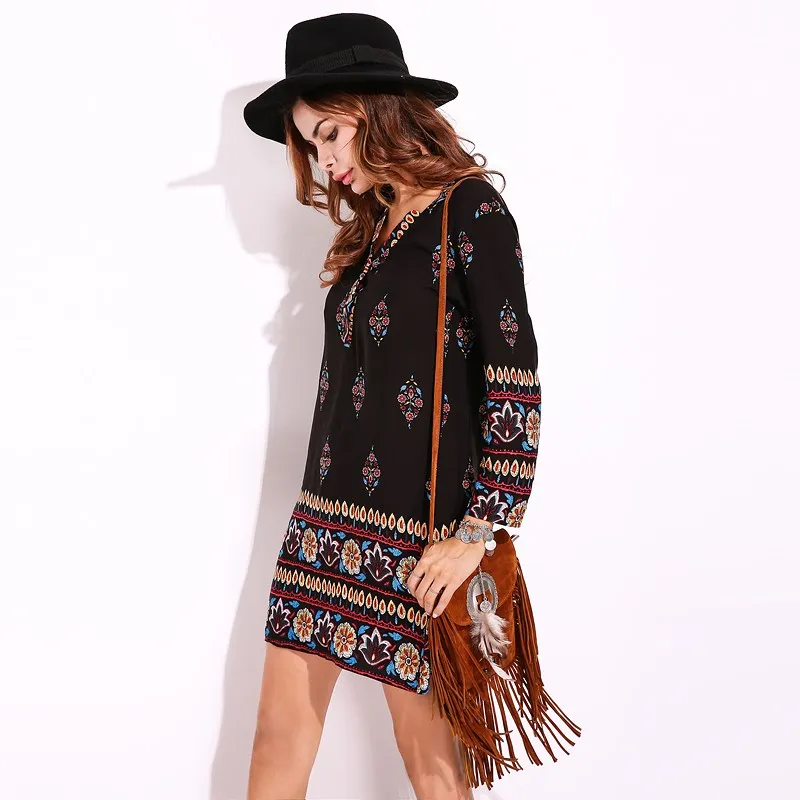 (37% Off) Купить Женское Короткое платье халат в этническом ретро стиле, повседневное винтажное платье с длинным рукавом и цветочным принтом, уличная одежд... Цена Дешево