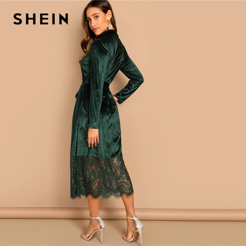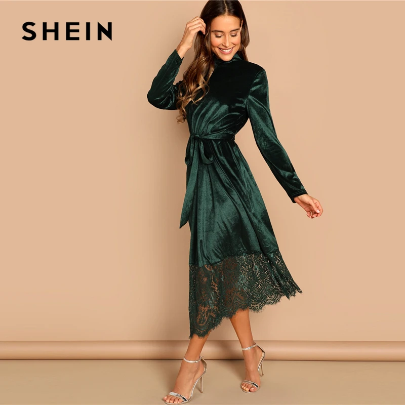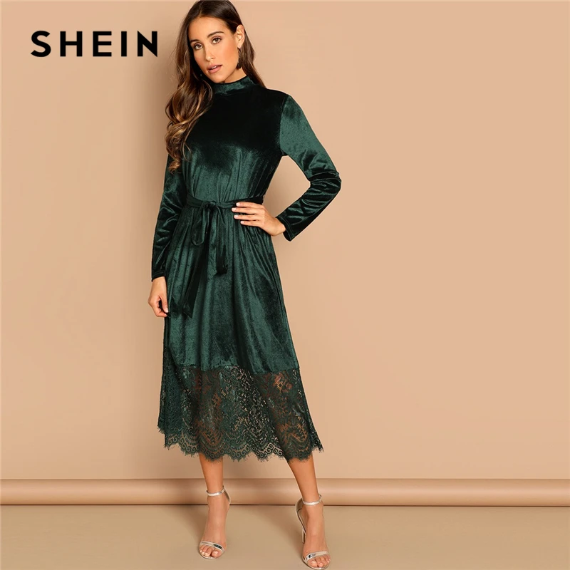 (42% Off) Купить SHEIN Бархатное Платье С Поясом, Элегантное Длинными Рукавами И Кружевом, Осеннее Повседневное Продажа Дешево