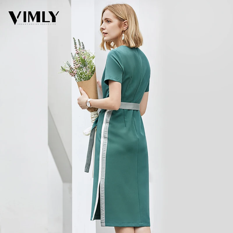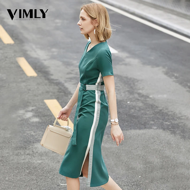 Special Offer Женское элегантное платье с v образным вырезом Vimly Green, летнее офисное платье средней длины для вечеринок, офисная одежда с поясом, высокое ка... Discount 49% Today!