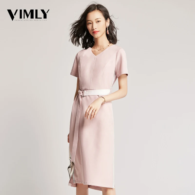 Product Name: Женское элегантное платье с v образным вырезом Vimly Green, летнее офисное платье средней длины для вечеринок, офисная одежда с поясом, высокое ка...