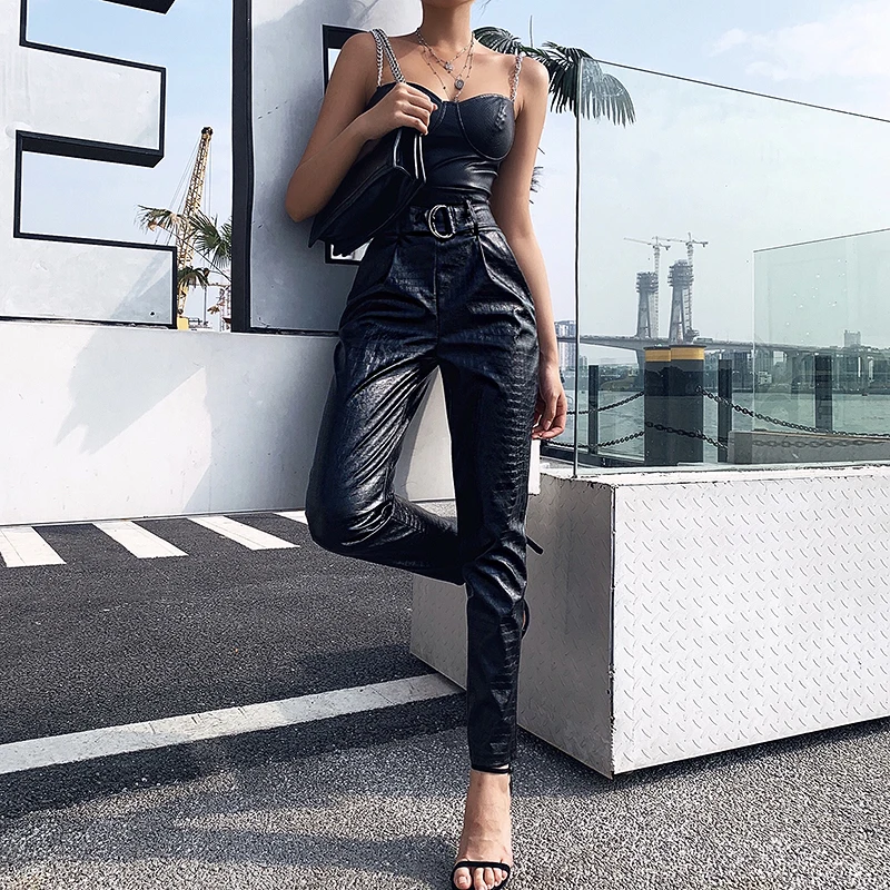Special Offer InstaHot брюки из искусственной кожи PU Hamer, женские повседневные элегантные черные брюки с высокой талией и поясом, женские Капри, женские осенн... Discount 51% Today!
