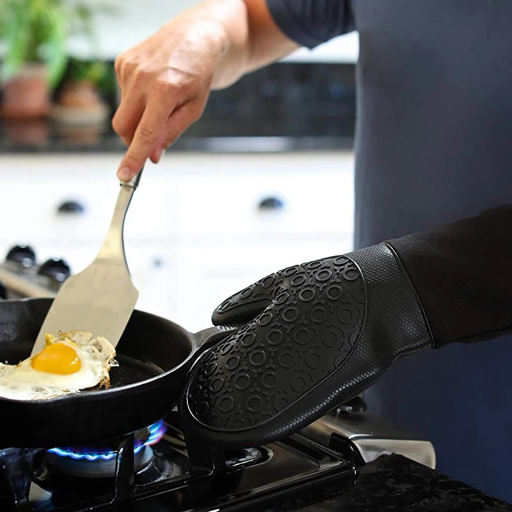 (15% Off) Купить Лучшие силиконовые рукавицы с стеганой хлопковой подкладкой Профессиональные Термостойкие кухонные перчатки 1 пара (черный) Продажа Дешево